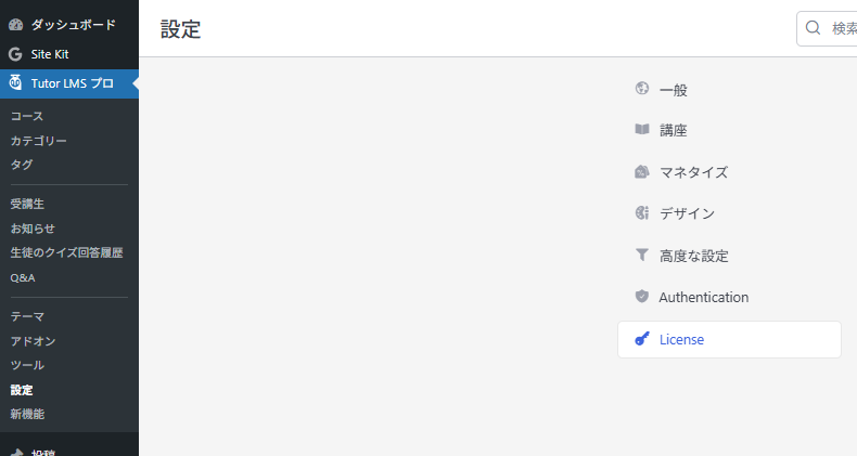 WordPressの管理画面にログインして、Tutor LMSの設定画面のLicenseにライセンスキーを入力してライセンスを有効化します。