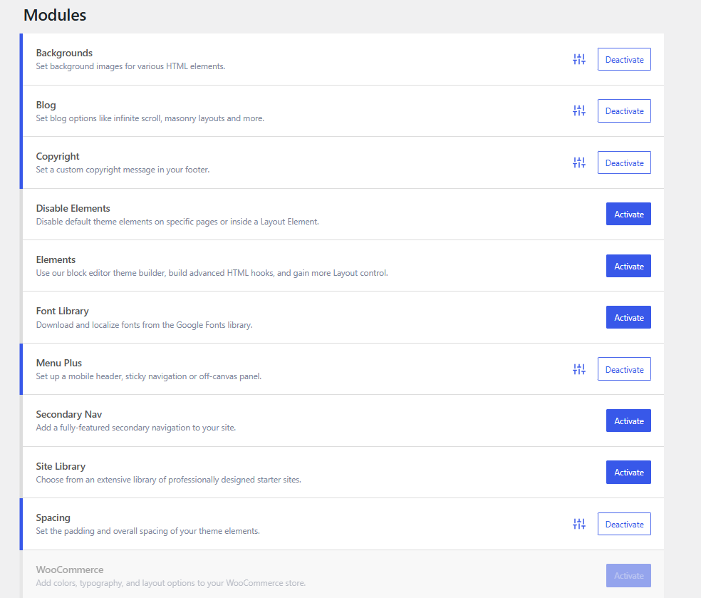 WordPressの管理画面にログインして「外観> GeneratePress」からModulesで必要な機能を有効化していきます。