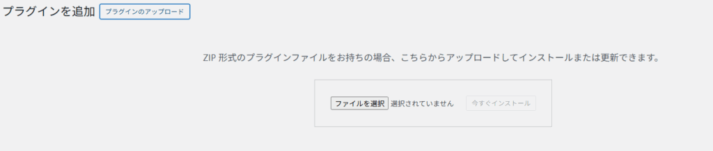 「プラグイン > プラグインを追加」から「プラグインのアップロード」ボタンを押下して「ファイルを選択」ボタンを押してzipファイルからプラグインをインストールします。